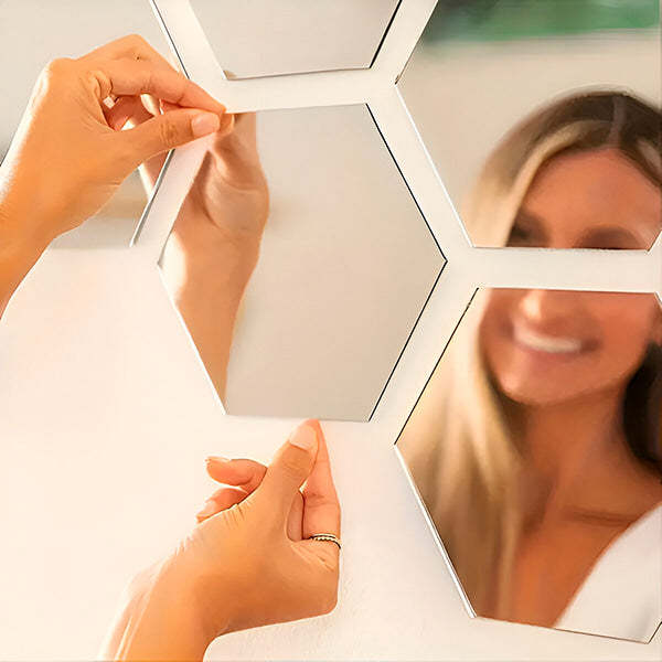 Samolepljive nalepnice sa šestougaonim ogledalom su dekorativni dodatak koji trenutno ulepšava izgled vašeg doma. Ovo je pristupačan i elegantan način da ukrasite svoje zidove.